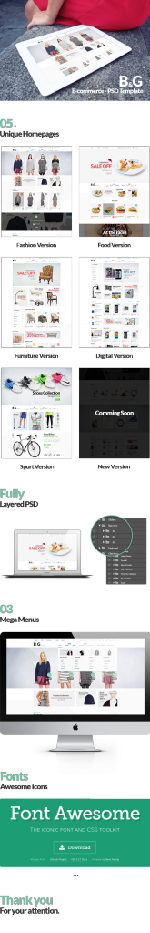 B&G – Ecommerce PSD Template is a uniquely ecommerce website template designed in Photoshop with a modern look. PSD files are well organized and named accordingly so its very easy to customize and update. 13 PSD Files Include.