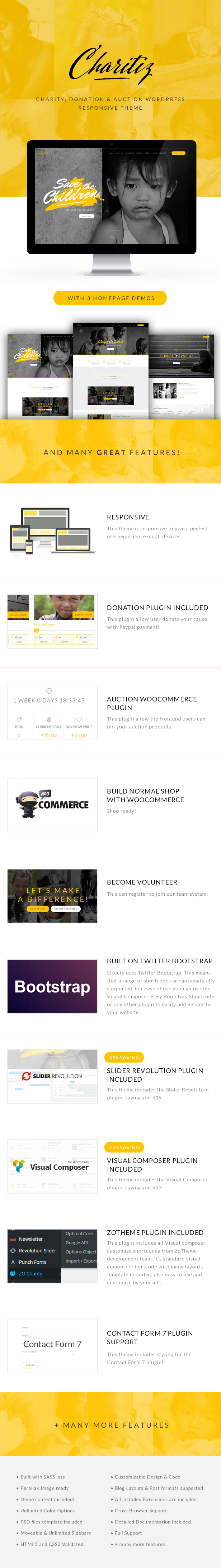 Charitiz is a clean responsive Wordpress theme. It is especially designed for charity, NGO, non-profit organization, donation, church or fundraising website. We create a custom post type ‘Donation’ for easily managing Cause & Donation. We also have integrated donation feature in this theme (PayPal). The system will automatically collect amount of money that sent to PayPal and convert to percentage bar for each cause. The system will also automatically send payment evidence to sender’s email after process is succeeded. We are also create a custom post type ‘Auction WooCommerce’ for our stories, with this plugin you can easily make clone with regular and reverse auctions along with your regular products. The system will automatically email to Winner payer after process auction closed. Email notifications (with editable email templates) for won auction, failed auction, pay for won auction notification, outbid notification, reserve not met fail, auction sold for buy now price notification…etc